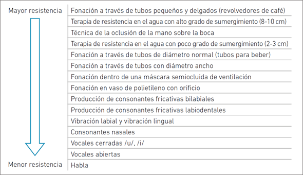 Los ejercicios de tracto vocal semiocluido se pueden ordenar en ejercicios de mayor a menor resistencia. Los ejercicios de mayor resistencia proporcionan el mayor efecto oclusivo, pero son más artificiales y los ejercicios de menor resistencia presentan efecto oclusivo reducido comparables al habla conectada (Cuadro 1) [11].