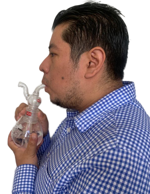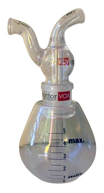 Doctor Vox: Es un dispositivo de vidrio que presenta una parte inferior llamada contenedor y en la parte superior presenta dos tubos: el tubo de entrada y el tubo de salida (forma de cisne). La altura máxima del agua en el contenedor está diseñada para estar por debajo del umbral de presión de la fonación. El tubo interno de entrada es para realizar los ejercicios de fonación y el tubo de salida en forma de cisne puede utilizarse para humedecer los pliegues vocales de manera instantánea, al aspirar el vapor del agua caliente que se recomienda poner en el dispositivo (Figura 3 y 4) [14].