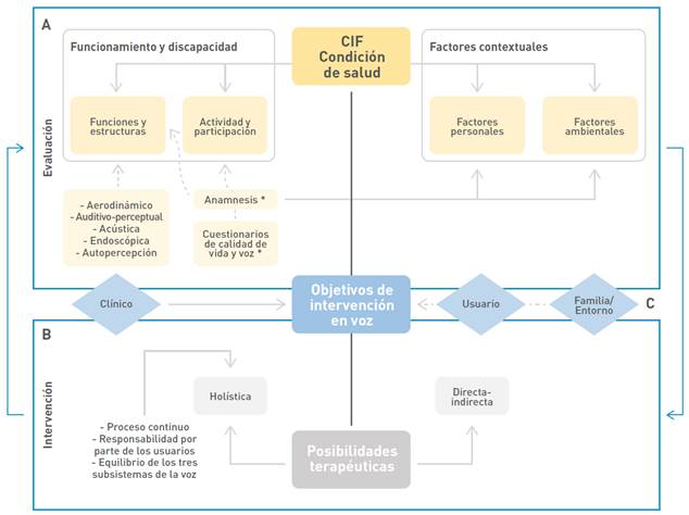 En este sentido, la CIF propone indagar y describir el Funcionamiento y la Discapacidad de la persona, en base a componentes tanto de funciones y estructuras corporales como de la actividad y participación de la persona con quejas vocales, junto con los factores ambientales y personales que den cuenta de su bienestar comunicativo. Se deberían incorporar, por tanto, la información de anatomía y fisiología vocal obtenidos de los exámenes objetivos y la evaluación vocal auditivo perceptual, acústica y aerodinámica de la voz, además de la descripción de las capacidades y desempeños vocales en distintos contextos (terapéutico, familiar, social, laboral). Para que esta descripción considere la perspectiva del terapeuta y la del usuario, incluyendo su familia y entorno, podrán usarse autorreportes, entrevistas en profundidad, estudios de puesto de trabajo, entre otras, determinando de este modo limitaciones en la actividad y restricciones en la participación, así como aspectos conservados de la misma respecto a la comunicación. Será fundamental integrar a esta descripción los facilitadores y barreras ambientales y personales que interactuarán con los otros componentes para el desarrollo de la terapia y, en torno a éstos, seleccionar aquellos que son posibles de abordar en el proceso de intervención [6,12]. Para una revisión más profunda aplicada al área de voz, se recomienda la propuesta de Ma et al. [13].