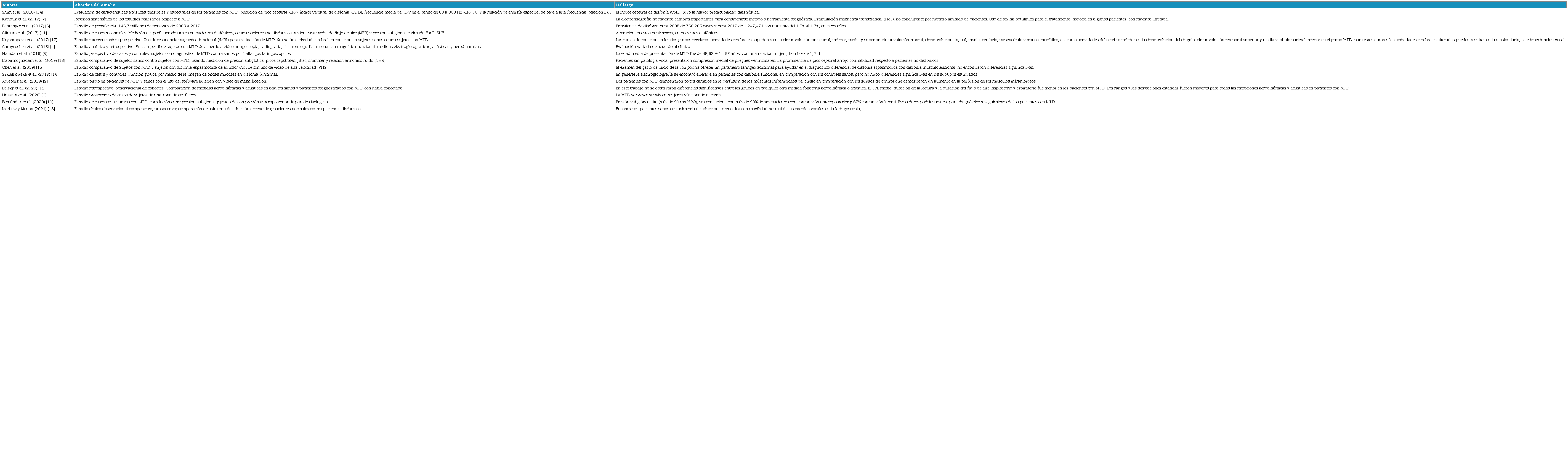 En total se obtuvieron 42 artículos: 27 de ellos excluidos, ya que su enfoque era principalmente terapia de voz u otra patología relacionada con la MTD; uno más fue retirado por estar en idioma coreano. De los 15 artículos restantes, tres se refieren a la necesidad de realizar más exploración instrumentada y una adecuada historia clínica para llegar a un oportuno diagnóstico.