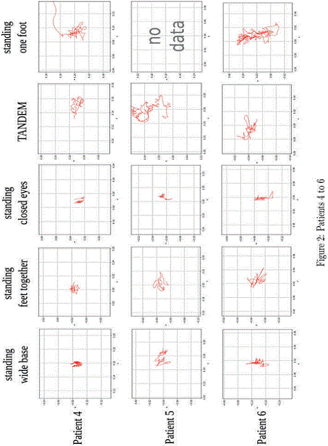 He data collected by Kinect was then processed by the regression model to produce a set of stabilograms (Figures 1 and 2) for patients 1 to 6 presented in Table 1; 28 stabilograms were obtained since two of the patients were not able to perform the last exercise (i.e. standing on one foot), due to the balance deterioration (these are labelled as “no data” in Figures 1 and 2). In all cases, stabilograms were plotted over a specific area of 8 × 8cm2 to visualize sway paths in detail, as well as to make direct comparison among the exercises for a singular subject or one exercise for different patients.