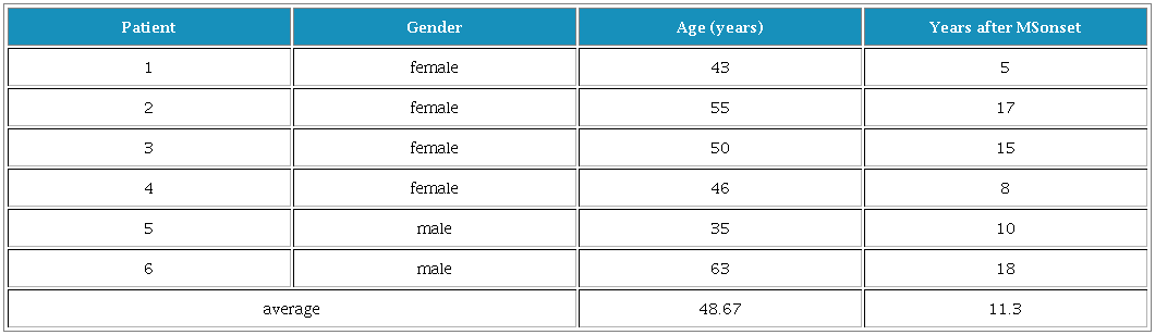 In terms of the subjects included in the study, the information presented in Table 1 show a predominance of women, with a time after onset no greater than 20 years, in accordance to the prevalence and symptomatology described for Multiple Sclerosis in the literature review. Respecting to the physiotherapists present in the study, one is an undergraduate student and the other is a teacher with an important clinical experience.
