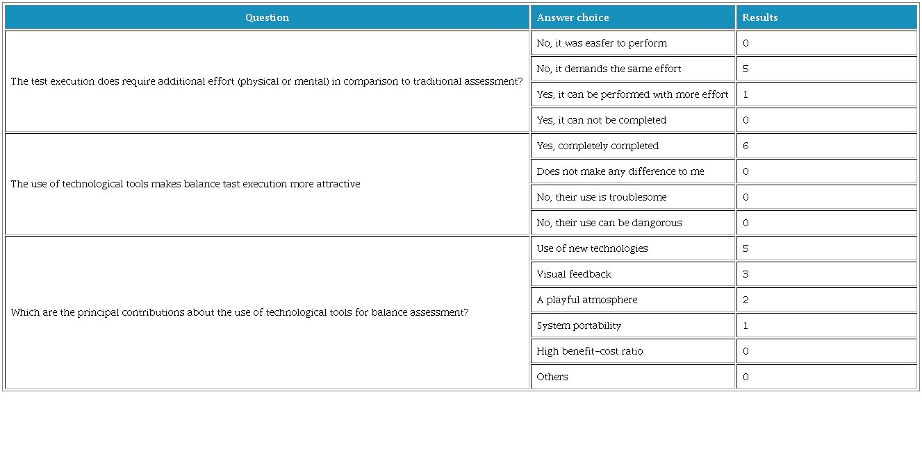 Results in Table 2 reveal that, in most cases, the introduction of a technological tool does not imply less effort by the patients to perform balance test. In just one case, the patient felt that balance test execution was harder using the Kinect device. However, all patients agreed on the inclusion of technology makes the test execution more attractive and they pointed out some advantages such as the introduction of new technology (5 of 6 agreed), visual-feedback about their current performance (3 of 6 agreed), a playful atmosphere (2 of 6 agreed) and the portability of the system (1 of 6 agree).