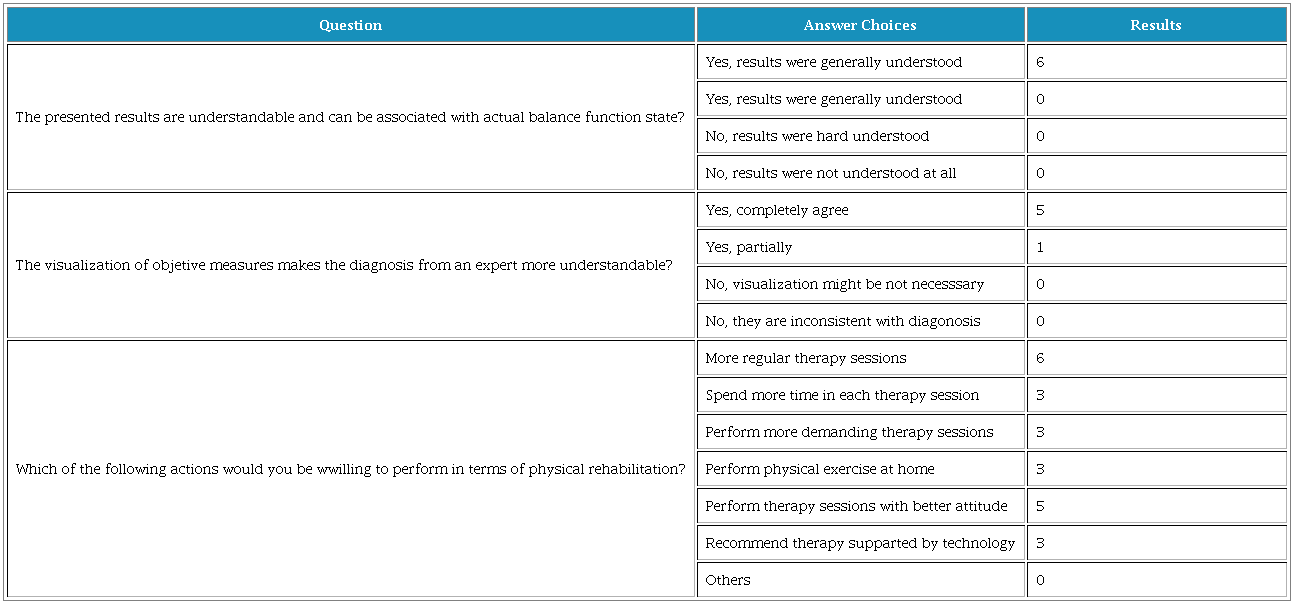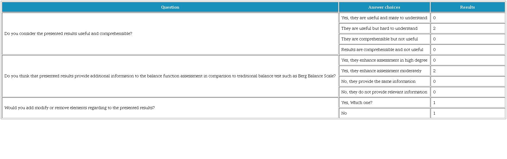 The instrument given to physiotherapists also has 6 questions, 3 to be answered after a balance test data acquisition, and 3 after a visual examination of the stabilograms (COG trajectories) yielded by the model, in terms of balance and postural control assessment. First 3 questions assess the software usability to perform postural data acquisition and explore their opinion on the sufficiency of the acquired data to estimate balance measures. Last questions examine the comprehension of the obtained results after visual inspection and their potential contribution for balance function assessment in comparison to standard functional balance test such as Berg Balance Scale. In those last questions, clinical staff are also asked about the inclusion of new measures, or visualization elements, able to be constructed from postural data, as expert hints for further development. The corresponding questions are:
