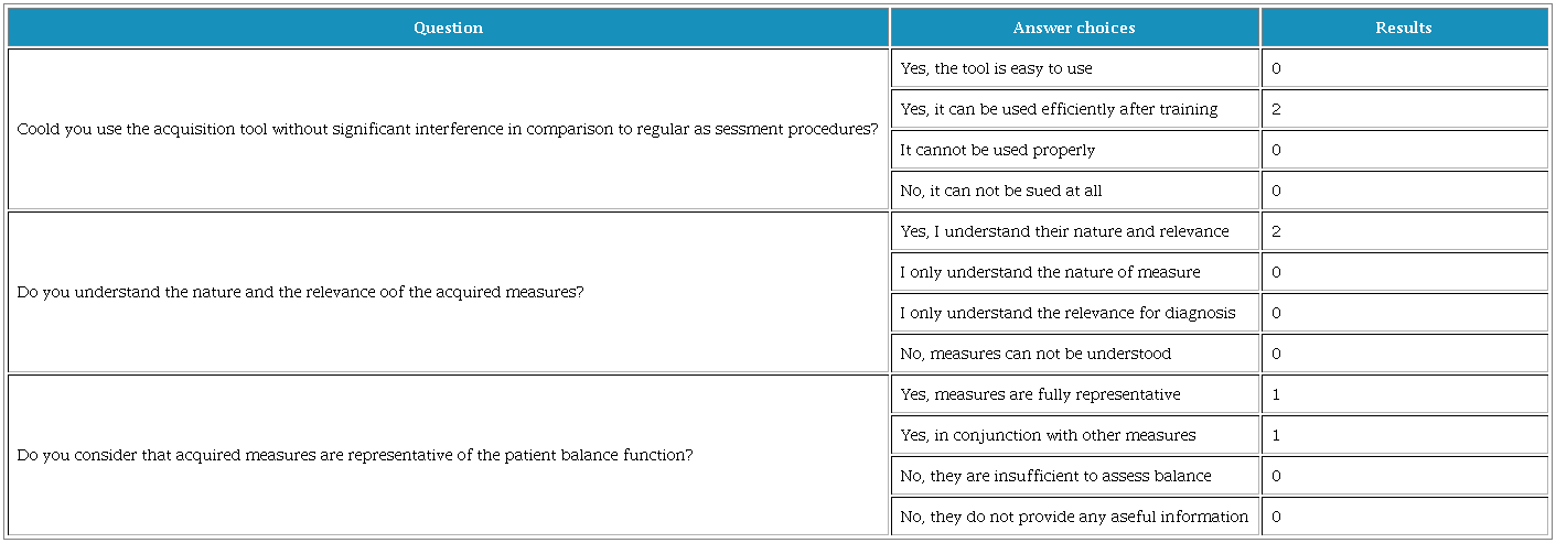 Results in Table 4 show that a training session was needed to manipulate the acquisition system efficiently without interfering a traditional assessment procedure. Yet, both physiotherapists were able to understand the nature and relevance of the obtained measures for balance assessment. However, just one of them consider postural data as a representative measure of balance, whereas the other one felt that measures are only representative of the balance function in conjunction with complementary measures.