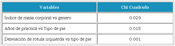 Lo anterior evidencia que hay asociación entre el tipo de pie y algunas variables medibles en el grupo de estudio.
