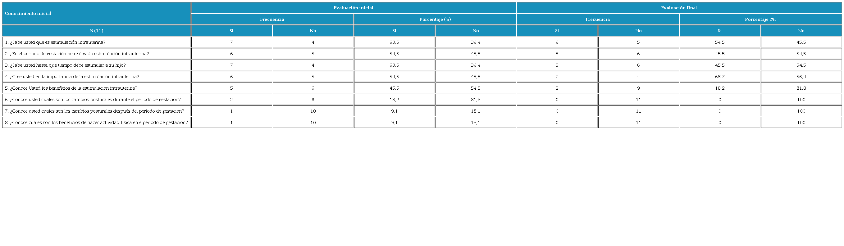 Se aplicó una encuesta para determinar los conocimientos que tenían las participantes sobre EI y AF, elaborada por el grupo investigador, en la cual se respondía sí o no a las siguientes preguntas: ¿Sabe usted que es estimulación intrauterina?, ¿En el periodo de gestación ha realizado estimulación intrauterina?, ¿Sabe usted hasta que tiempo debe estimular a su hijo?, ¿Cree usted en la importancia de la estimulación intrauterina?, ¿Conoce usted los beneficios de la estimulación intrauterina?, ¿Conoce usted cuales son los cambios posturales durante el periodo de gestación?, ¿Conoce usted cuales son los cambios posturales después del periodo de gestación? y ¿Conoce cuáles son los beneficios de hacer actividad física en el periodo de gestación?.