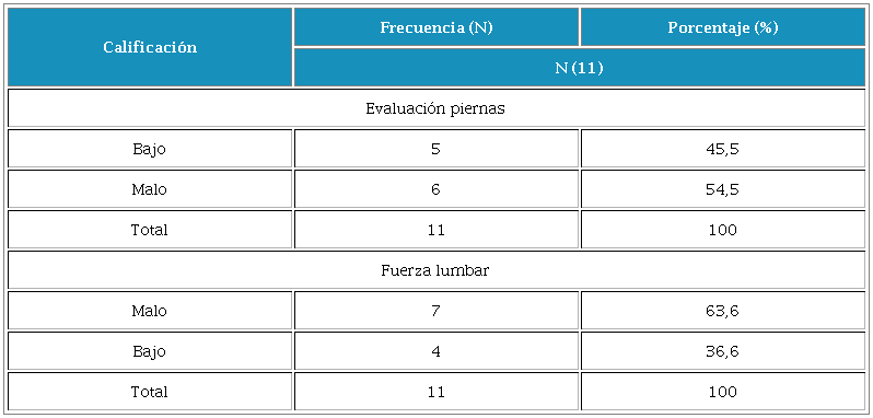 También, se realizó la evaluación inicial de la condición física aplicando los test de elevación de piernas y de fuerza lumbar (25 (26) (27), para la realización del primer test se ubica a la persona en posición supino sobre la colchoneta con las piernas elevadas a una altura de 30º, con la planta de los pies apoyados en la pared y la cabeza tocando la colchoneta. Los miembros superiores se ubican de tal manera que las palmas de las manos toquen el hombro contrario de su brazo, el test inicia cuando la persona mantiene las piernas juntas en elevación a una altura de 30º separando los pies de la pared, termina cuando transcurre un minuto o cuando sea incapaz de seguir realizando el ejercicio. El segundo la posición inicial de la persona es en supino sobre la colchoneta con las piernas elevadas a una altura de 30º, los talones sobre un banco y la cabeza tocando la colchoneta, los miembros superiores estarán ubicados de tal manera que las palmas de las manos reposen sobre la colchoneta, se inicia cuando la persona con las piernas juntas sin flexionar las rodillas suben y bajan las extremidades inferiores a una altura de 30º y cuando baja los tobillos no tocan el piso.