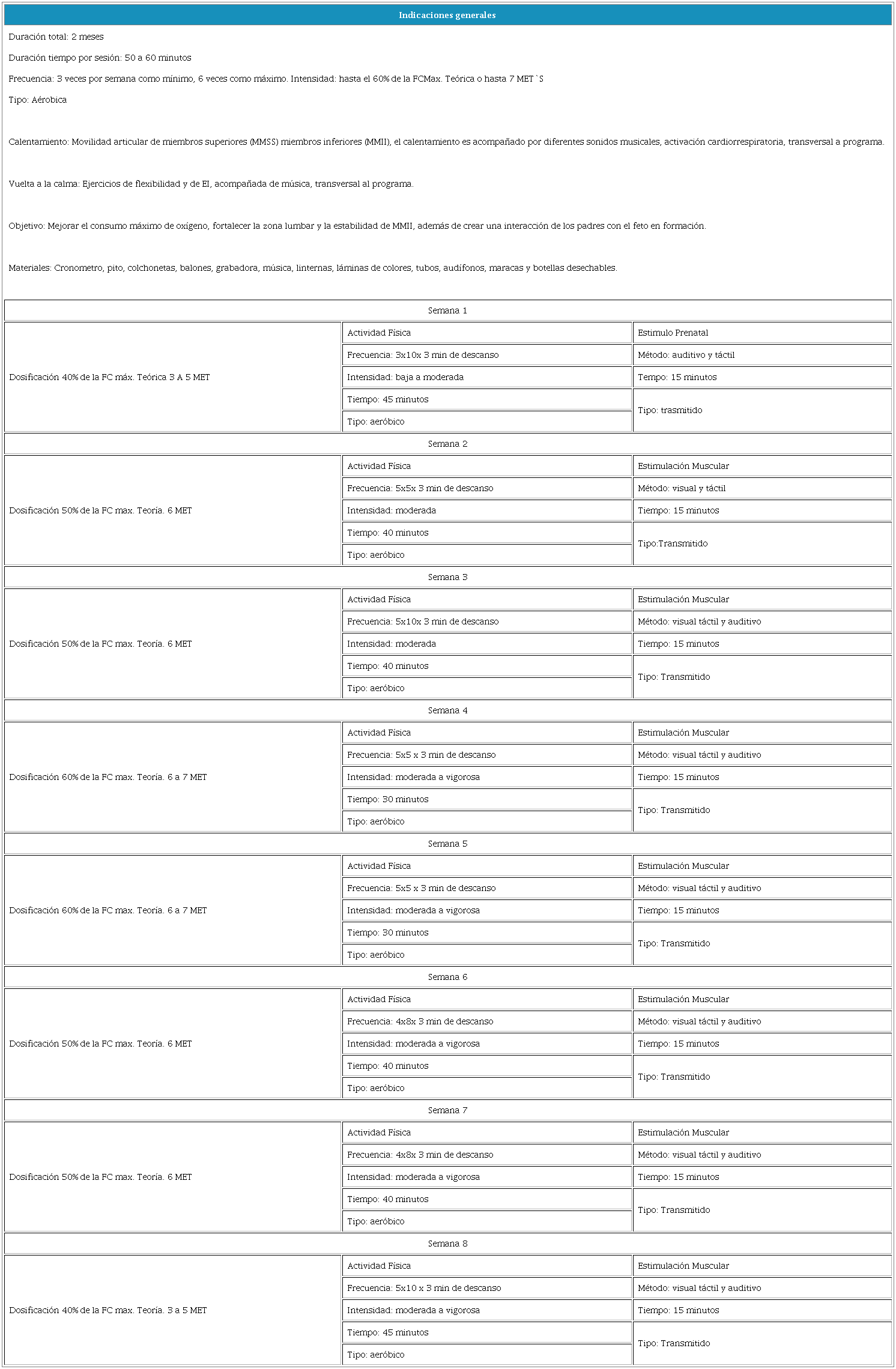 De lo encontrado y como producto de trabajo de campo, se desarrolla una propuesta de intervención en actividad física y estimulación intrauterina, para desarrollar en 20 semanas, a así lograr conseguir los beneficios para la salud de la madre y el feto, la propuesta se presenta en la siguiente tabla. La descripción de las actividades se pueden evidenciar en el anexo 1.