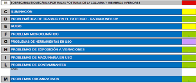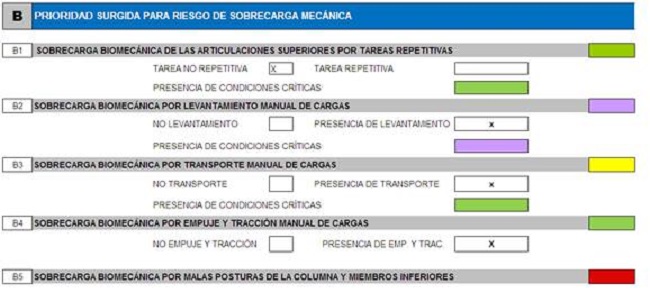 Luego, se valora la sobrecarga biomecánica que tienen los trabajadores al desarrollar las funciones de mantenimiento, se sigue la misma metodología de la prioridad según el color que arroja la aplicación de la metodología (Figura 2).