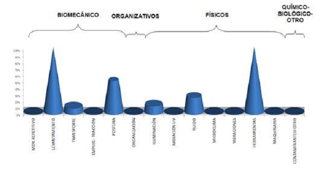 A partir de la aplicación de la metodología de evaluación ergonómica del CENEA, se cuantifica el riesgo estableciendo el porcentaje de cada uno de los factores de riesgo, como se aprecia en la Figura 3.