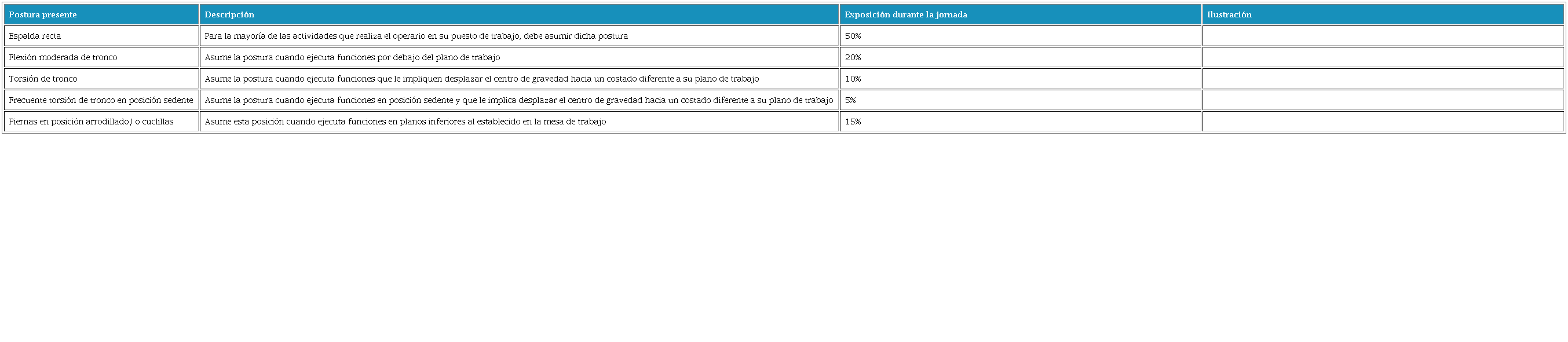 Inicialmente, se evalúan las posturas forzadas que realiza el operario durante la ejecución de la jornada laboral, para establecer el porcentaje de exposición que tiene el trabajador (Tabla 1).