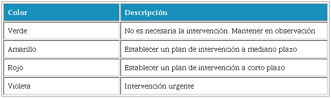 Seguido a esto, se realiza la valoración de los factores de riesgo por sobrecarga mecánica, allí, se establece la prioridad de intervención a través de la asignación de colores, tal como se describe en la Tabla 2. Los resultados de la valoración, se establecen en la Figura 1.