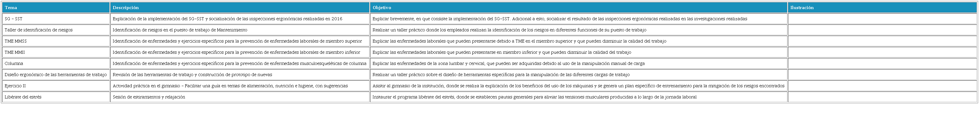 A partir de la evaluación y valoración de los factores de riesgo físico, generados del desempeño de las funciones del puesto de trabajo de mantenimiento, se establecen los contenidos específicos a desarrollar en la escuela osteomuscular.