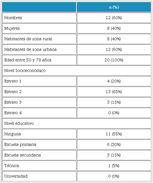 Un total de 20 pacientes, 8 mujeres y 12 hombres, entre los 50 y 78 años, con un bajo nivel académico, residentes de zona rural y urbana de algunos municipios de Antioquia Colombia, participaron en la intervención educativa y recibieron todo el contenido, no se presentaron datos perdidos lo que equivale a una tasa de pérdida de 0%. (Tabla 2.)
