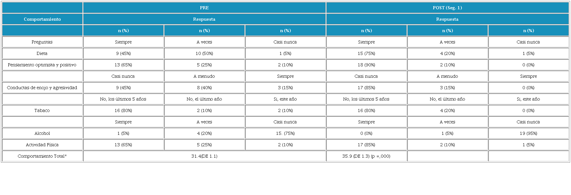 Los cambios más significativos se presentaron en la ingesta de frutas y verduras mostrando un aumento del 30% entre antes de la intervención y el primer seguimiento, en el pensamiento positivo también mejoró de un 65% a un 90%, frente a la oración dejar de sentirse enojado se presentaron cambios del 45%, en relación al hábito tabáquico se presentó un impacto menor en la conducta pero se evidencio que dos participantes de los 20 no habían fumado después de la intervención. Hubo cambios relevantes en mejora de casi todas las preguntas del cuestionario, lo que significa una adhesión por parte de los participantes. (Ver tabla 4.)
