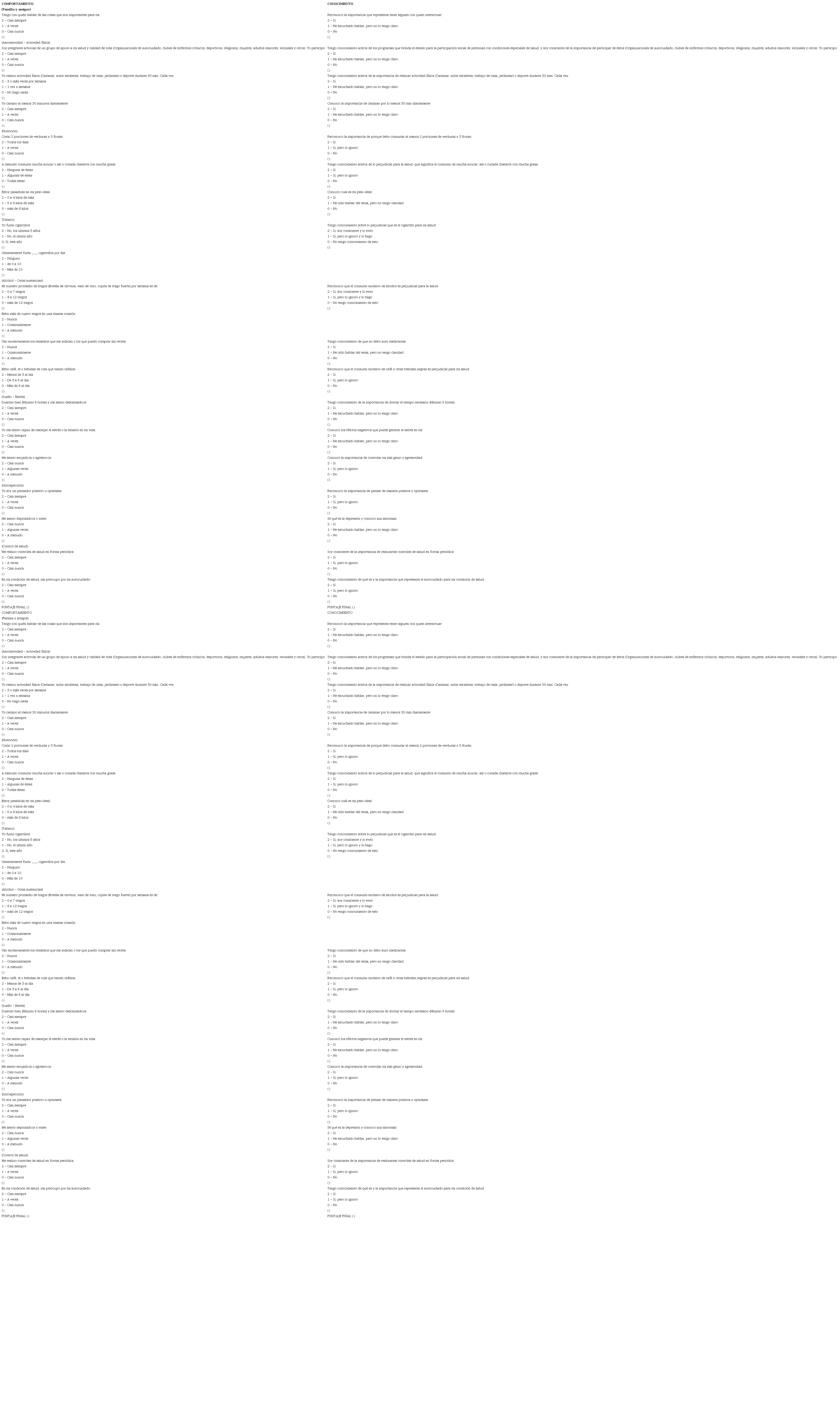 Para la recopilación de los datos fue utilizada una encuesta tipo likert creada por los investigadores basada en el cuestionario FANTÁSTICO (18,19, 20), al cual se le hicieron adaptaciones de constructo y se realizó validez de contenido en consenso de expertos. (Ver anexo 1). Se evaluaron los siguientes criterios, comportamentales y de conocimiento: entorno familiar y amigos, actividad física, nutrición, tabaquismo, alcohol, otras sustancias, sueño, estrés, introspección y control de salud.