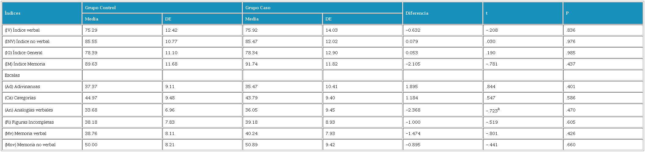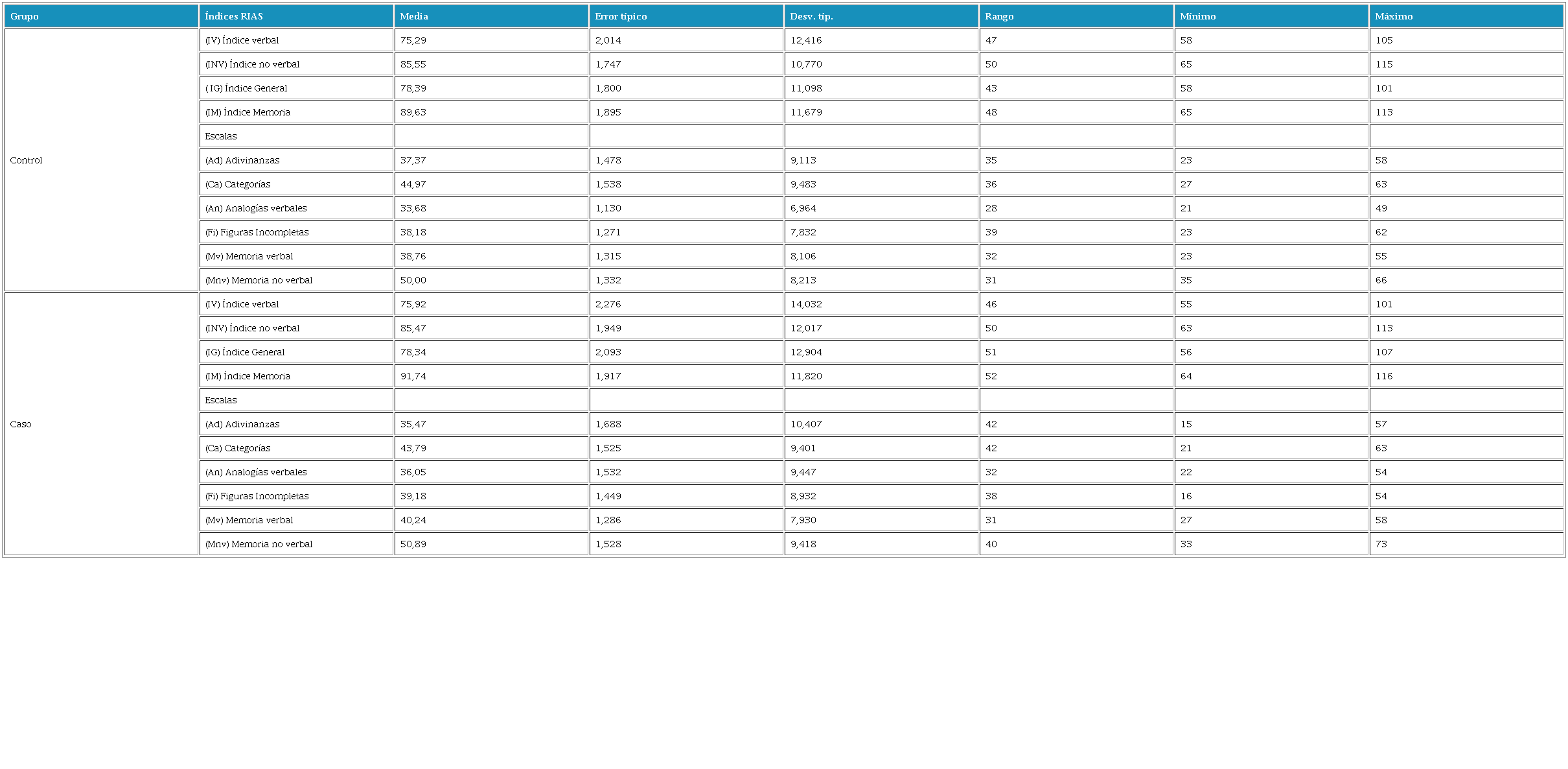 En la tabla 1 se presentan los estadísticos descriptivos del RIAS para grupo caso y grupo control. En general se evidencia un menor desempeño de los sujetos tanto del grupo caso como del grupo control a nivel de las escalas que componen el índice de inteligencia verbal, a diferencia del índice de inteligencia no verbal e índice de memoria.