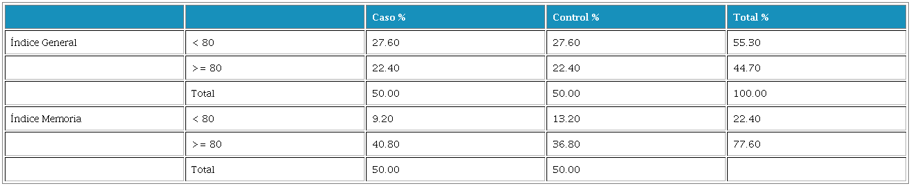 La Tabla 3 muestra que las proporciones para el índice general que se encuentran por debajo del punto de corte, respecto a los grupos caso y control no varían. Respecto al Índice de Memoria se observa que las proporciones encontradas son similares para ambos grupos.