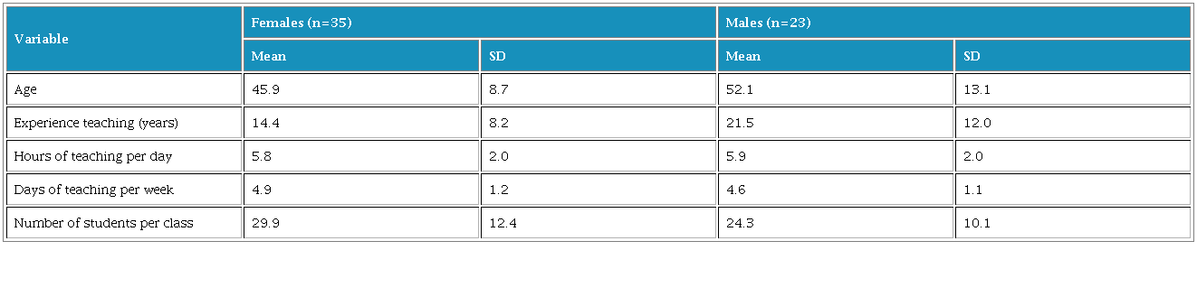 In total, fifty-eight college professors participated in this study. During data collection, twenty-nine subjects did not inform their average monthly salary. Therefore, they were included in the analysis of productivity reduction but excluded in the costs analysis. Among the fifty-eight participants, 35 were females and 23 were men. Men professors were older, had more experience as teachers, and worked more daily hours using their voices compared with female professors. The days of teaching per week and number of students per class were higher for female participants compared with male participants (Table 1).