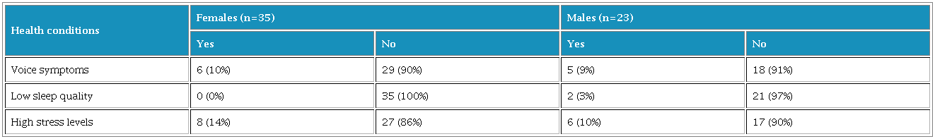 Among all participants, 19% of them reported having had voice symptoms in the last month. Only two male subjects reported low sleep quality (3%). Female professors reported higher levels of stress (14%) than their male pairs (10%) as shown in Table 2.