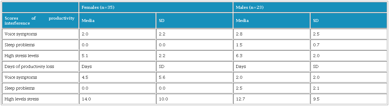 On average, there was a greater interference at work among male professors (2.8) compared with females (2.0) due to voice symptoms. Likewise, males showed more productivity loss due to stress levels (6.3) compared with their female colleagues (5.1). Male professors showed a 1.5 reduction in productivity due to sleep problems, whereas female participants reported a longer duration of voice symptoms (4.5 days) and high stress (14 days) compared to males (2 and 5.7 days respectively). Male professors with low sleep quality reported an average duration of 2.5 days (Table 3).