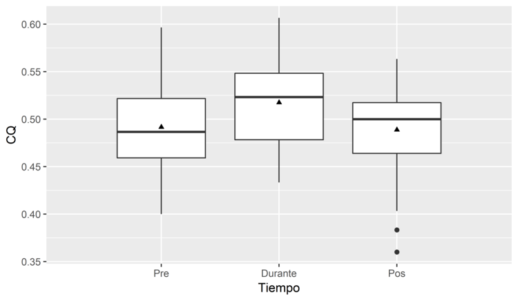 El promedio del CQ en los tres momentos de medición para cada uno de los ejercicios ejecutados se presenta en la Tabla 1. Adicionalmente, las Figuras 1 y 2 muestran la distribución del CQ en los tres momentos de medición y según cada ejercicio estudiado.