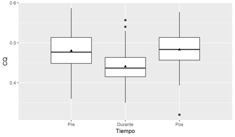 Luego de ajustar el modelo de análisis de varianza (ANOVA), se encontró que no existe efecto del tratamiento sobre la variable respuesta (p=0.562), no existen efectos residuales de un tratamiento sobre el otro (p=0.488) y el periodo de ejecución de los ejercicios tiene un efecto en los valores del CQ (p<0.001).