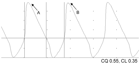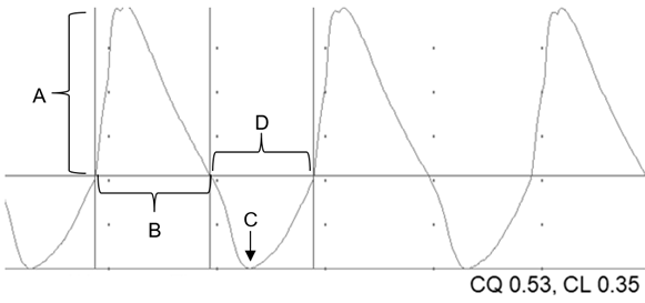 Al analizar las ondas electroglotográficas se apreciaron modificaciones en los perfiles de onda antes y durante la realización de los ejercicios. Para comenzar, durante la realización de la fonación en tubos, la consecución del contacto glótico máximo se logró más rápidamente, el perfil de onda se hizo más robusto durante la fase de cierre, lo cual provocó el aumento del CQ, y, adicionalmente, aunque la fase abierta tendió a ser más corta, exhibió una pendiente menos pronunciada en la zona de transición de la fase abierta a la fase de cierre, con un punto de apertura máxima que fue menos agudo (ver Figura 3 y 4).