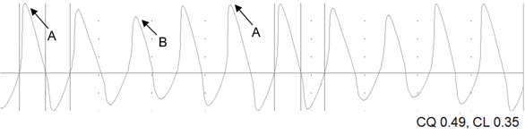 En cuanto al análisis de las ondas electroglotográficas durante la vibración lingual, puede afirmarse que antes de realizar el ejercicio, la amplitud de onda pico a pico se mantuvo en el mismo nivel a lo largo de los ciclos glóticos (Figura 5). Por el contrario, mientras los sujetos ejecutaban la actividad vocal, se observó una modificación oscilatoria de la amplitud pico. Dado que las muestras registradas eran de hombres y los periodos de onda eran tan extensos, fue necesario ampliar la ventana de análisis de 30 ms a 50 ms para poder observar el patrón. Este comportamiento fue homogéneo en la totalidad de las muestras evaluadas (ver Figura 6). La fase de cierre, el CQ y la fase de apertura posterior al ejercicio permanecieron prácticamente inalterados en comparación con la fonación antes de la ejecución del ejercicio.