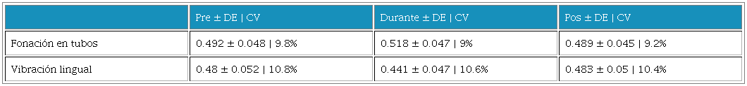 Resultados y conclusión: Se observó una diferencia significativa al comparar los valores del CQ antes y durante la realización de ambos ejercicios. No se encontraron cambios en este parámetro después de ejecutar la actividad. Estos hallazgos concuerdan con reportes previos en los cuales el CQ tiende a aumentar durante la fonación en tubos; contrariamente, la realización de la vibración lingual tiende a decrecer el valor del CQ. Es posible que este comportamiento se deba a los mecanismos biomecánicos particulares de cada ejercicio.