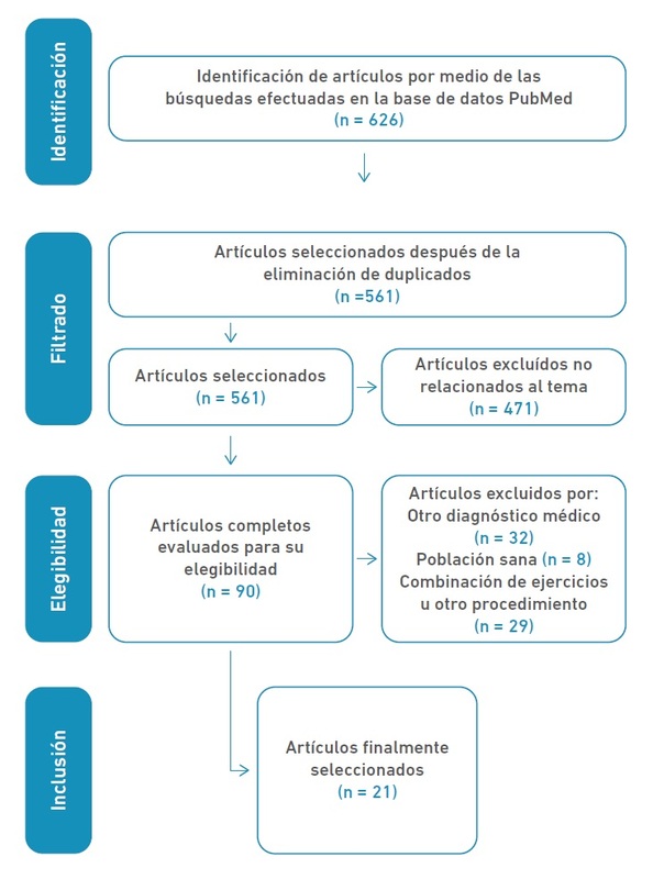 Tras la búsqueda, se seleccionaron veintiún artículos. Dieciocho de ellos corresponden a ensayos clínicos controlados aleatorizados y tres a ensayos controlados. Del total, veinte artículos utilizaron únicamente la Videofluoroscopía (VFC) como instrumento para evidenciar los efectos del tratamiento y un artículo utilizó ultrasonido. La Figura 1 muestra el flujograma de la selección de estudios, para luego describir las estrategias o técnicas reactivadoras que tras la búsqueda cumplían con los criterios ya mencionados.