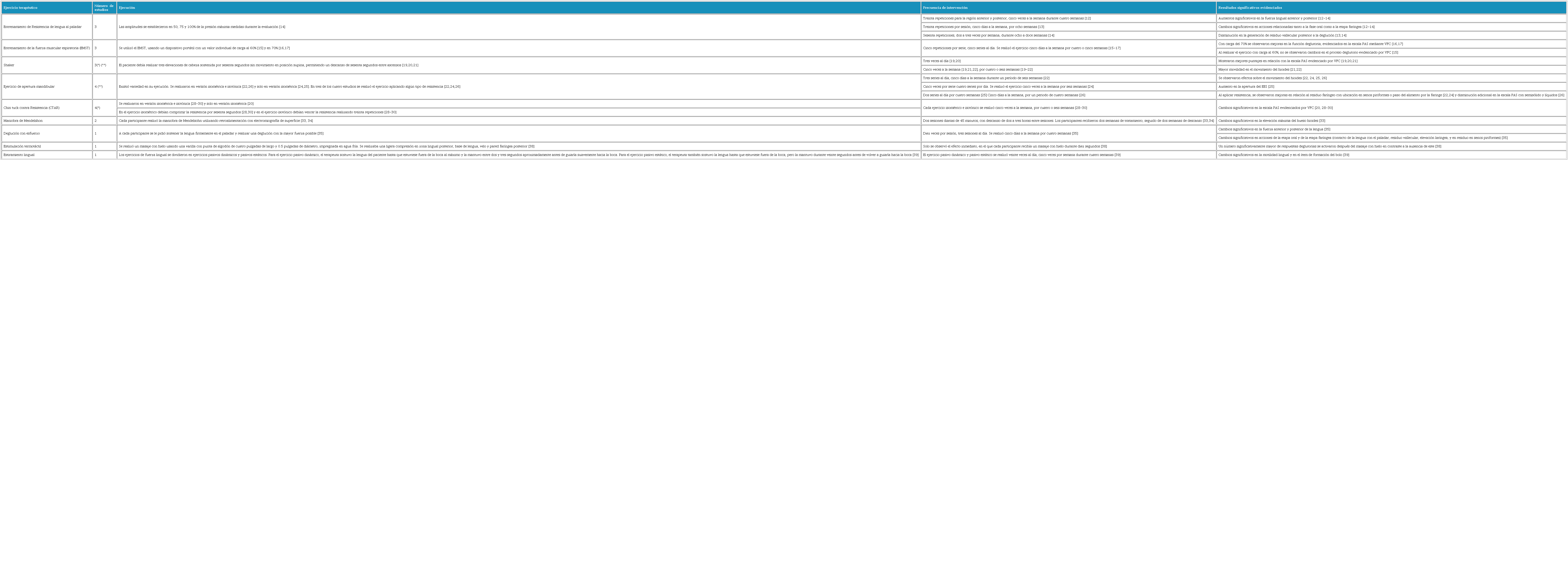 El ejercicio de apertura mandibular evidenció efectos positivos en componentes relacionados a la elevación del hueso hioides [22,24-26]. La versión del ejercicio en el que se aplicaba resistencia demostró mejoras en relación con residuos faríngeos [22,24] y disminución adicional en la escala PAS [26].
