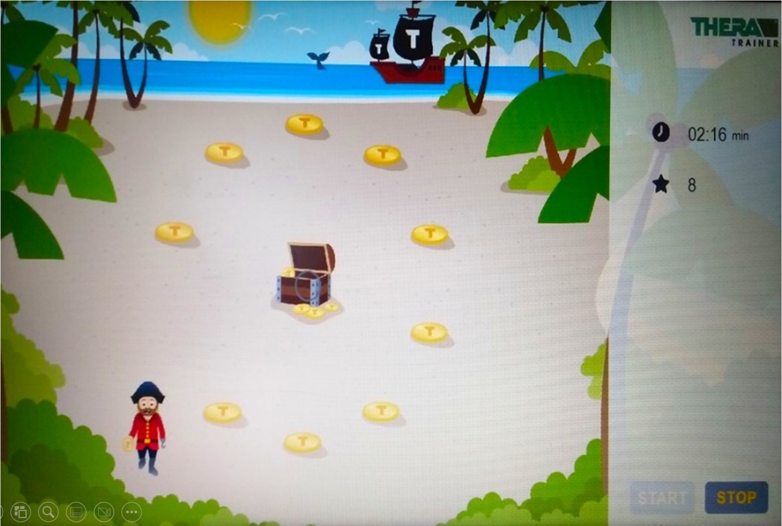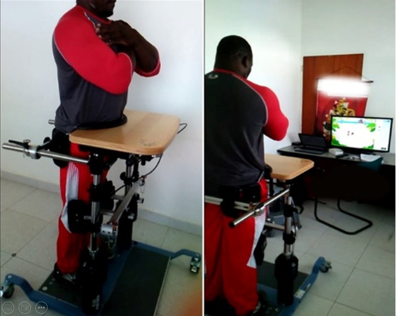 In the evaluation and intervention of trunk stability, the Thera-Trainer Balance platform (Thera-Trainer, Hochdorf, Germany) was used. It is a standing frame that can be adjusted according to the patient's needs, facilitates balance reeducation and trunk control [24,25]. In addition, it provides information on the displacement of the static and dynamic center of gravity during the tests pre-established by the equipment, using a movement sensor located on the platform. It also has a software Thera - Soft SB Basic that provides training through virtual reality, which contains recreational games that can be modified according to the needs of each athlete (Figure 1). The platform is placed at the level of the anterior iliac crest (as recommended by the manufacturer), although in cases of higher spinal injuries, the table is fixed at a level that allows the participant to achieve trunk control.