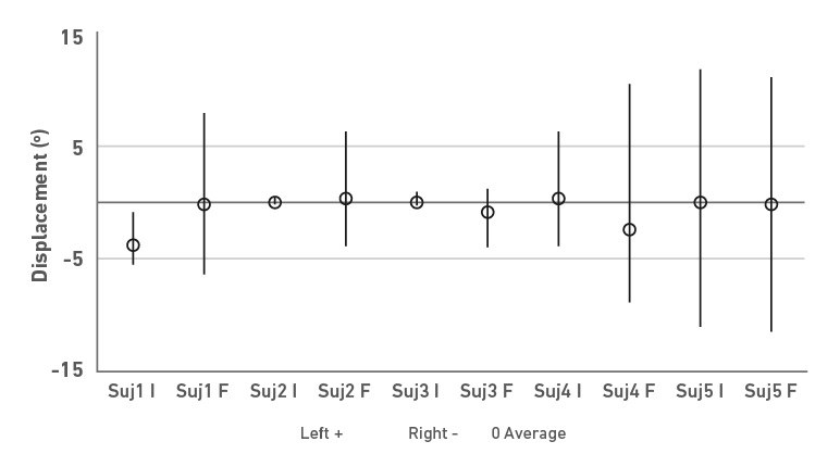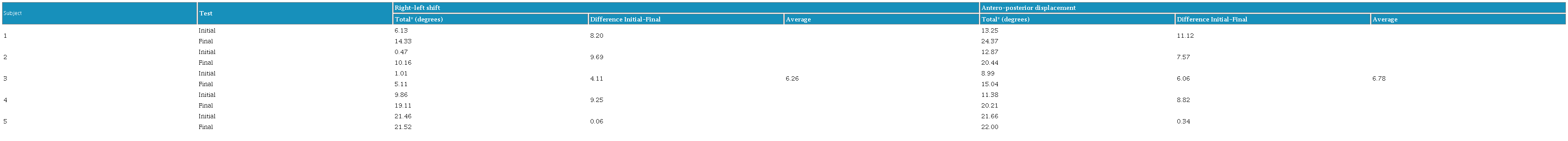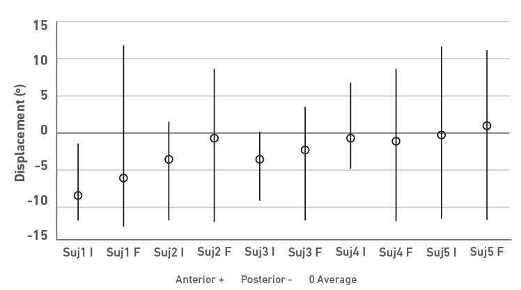 In the final evaluation, the range of displacement increases in almost all subjects (Table 3), except for subject 5, whose values remain practically stable in both the initial and final evaluations. The difference in displacement between the initial and final test on average of the participants was 6.26 degrees. Subjects 2 and 4 presented the greatest changes in the right-left direction, and subjects 1 and 4 in the anterior-posterior direction.