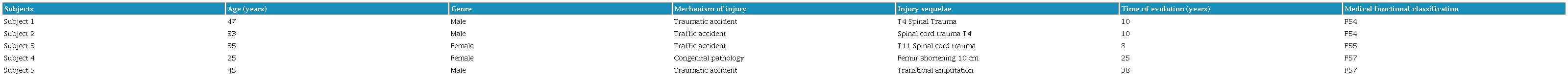 After applying the inclusion and exclusion criteria, the population analyzed consisted of five high-achieving athletes from the Valle National Team, Colombia, who participated in the Paralympic javelin throw. Three athletes present a history of spinal trauma; the other two have lower limb affectations. The demographic and clinical characteristics of the athletes participating in the study are presented below (Table 2).