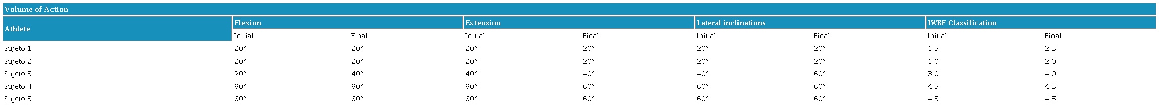 Concerning trunk control measured through the volume of action, the changes were less evident in quantitative terms. There was no significant variation in the results evaluated from the initial and final assessment, since subjects 4 and 5 maintained the maximum score of the rating scale. In contrast, in subjects 1, 2 and 3, who present spinal cord injury, the final qualitative assessment increased its value concerning the initial one. Only subject three presented changes in the degrees of trunk displacement in flexion and lateral inclinations (Table 4).