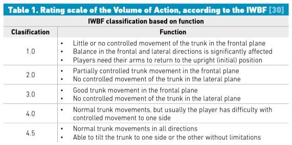 As an additional variable, each athlete was evaluated for trunk stability before and after the intervention, based on the volume of action in sedentary position. [28]. This evaluates the maximum displacement of the trunk in the anterior-posterior and lateral direction in a chair without backrest, and is used as a functional reference in Paralympic sport [29]. Although the scale has qualitative assessment parameters (Table 1), trunk displacement was also measured in degrees based on videography for this study.