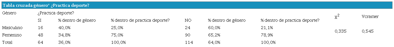 Un 64% de los estudiantes participantes manifiesta no practicar deporte o AF rigurosa de manera habitual, siendo menos inclinados hacia dicha práctica las mujeres (el 60% de los hombres y el 65,2% de las mujeres), categorías cuyas proporciones de columna no difieren de forma significativa entre sí en el nivel ,05 (ver Tabla 1). El 70,3% refiere que utiliza las instalaciones de la institución educativa para realizar la AF, seguido de un 12,5% que informa que lo realiza en parques.