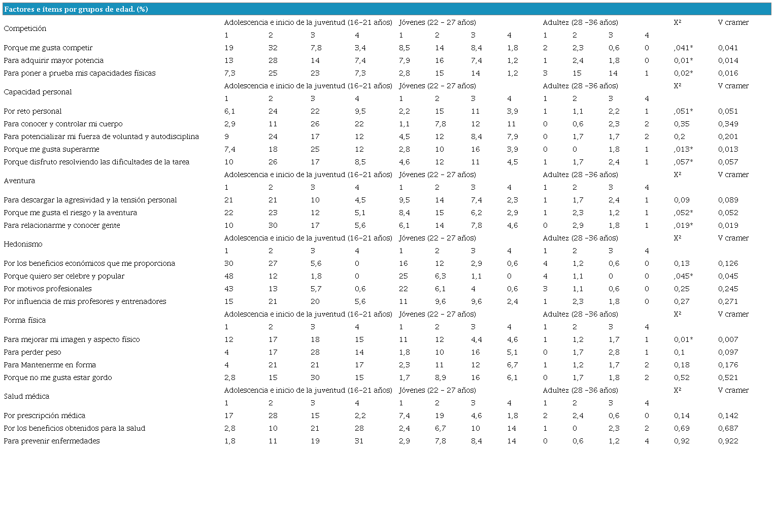 En las Tablas 2 y 3 se presentan los 22 motivos para la práctica de actividad físico-deportiva, bajo los seis subgrupos considerados por el instrumento CAMIAF, con relación a la edad (grupos) y el género. También se incluye la información obtenida a partir de las preguntas abiertas sobre aspectos que no le motivan o que le dificultad la realización de actividades físico-deportivas.