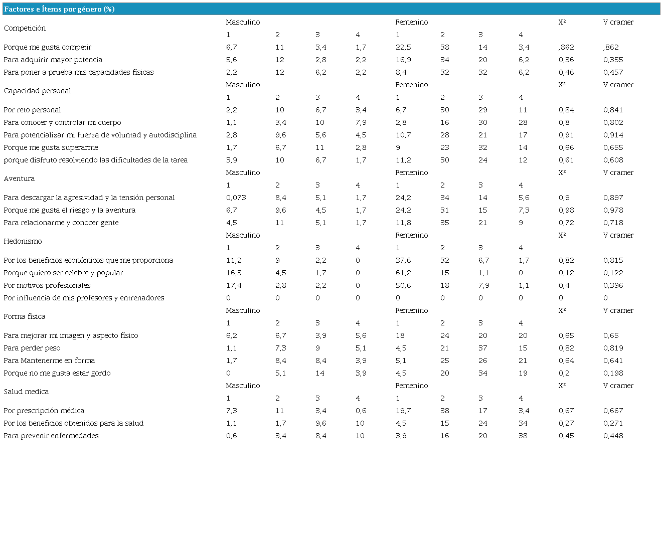 Conclusions: Among the motivations for the practice of PA, the following factors predominate in this order: competition, social and recreational, and aesthetic. The least motivating factor was the emotional one.