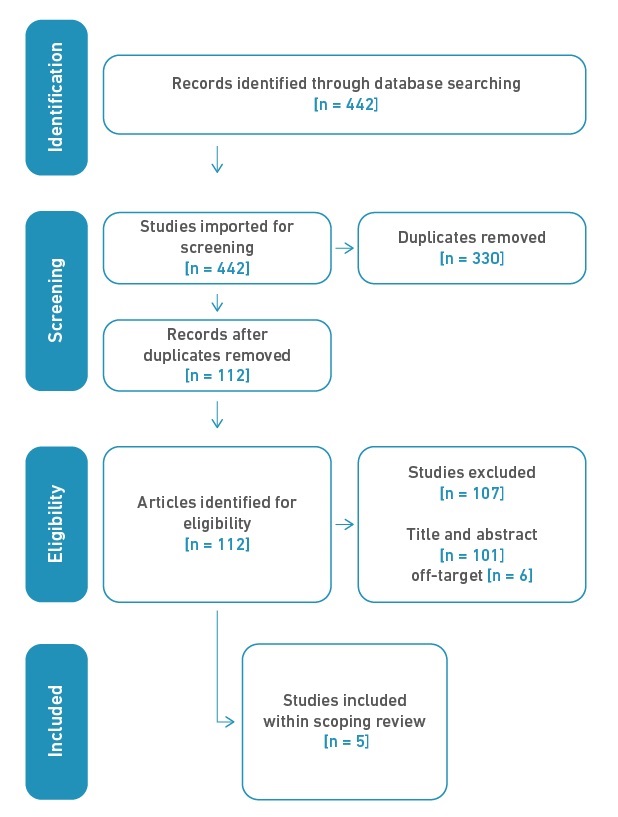 This process resulted in the identification of 442 articles. After duplicates were removed, 112 were examined by title and abstract, of which 11 were selected for full text reading. Finally, five studies were selected (see Figure 1). Only studies that compared the effect of polarized TID model with other TID models on running time in recreational athletes were included in this scoping review.