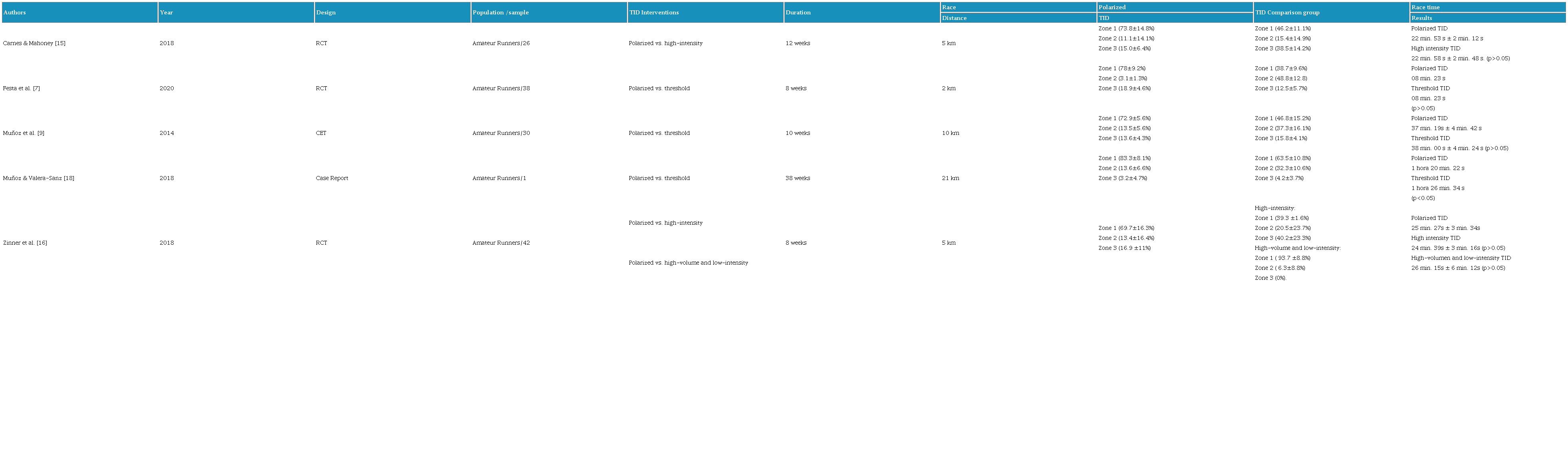 Conclusions: The model with polarized TID did not show significant differences in race time compared to other models, except for a case report in which the polarized TID was higher by 21 km compared to the threshold TID: 1 hour. 20 min. 22 seconds and 1 hour. 26 min. 34s, respectively. The scarce evidence found, the heterogeneity in the distances in the evaluated race time, the distribution of zones in the same TID, the duration of the interventions, and the monitoring of the loads, are the main limitations found in the studies. The polarized TID could contribute to adherence, lower perception of effort, and injury prevention. However, this must be tested in future studies.