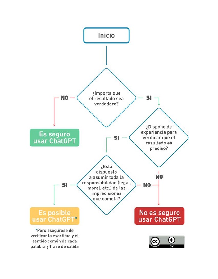Como podemos ver, este diagrama impone la necesidad de un uso responsable y transparente de esta IA. Es por ello que ChatGPT debería utilizarse bajo una doble perspectiva, que incluye la ética y el pensamiento crítico [7]. La ética se traduce en que en cada contexto puede tener una implicación específica que hay que atender, además de que siempre debemos ser transparentes con su uso y por tanto como investigadores tendremos que citar y mencionar cómo se usó en el apartado de metodología. El pensamiento crítico nos lleva al mandato categórico de que debemos reflexionar y verificar la coherencia de cada propuesta antes de usarla en trabajos académicos.