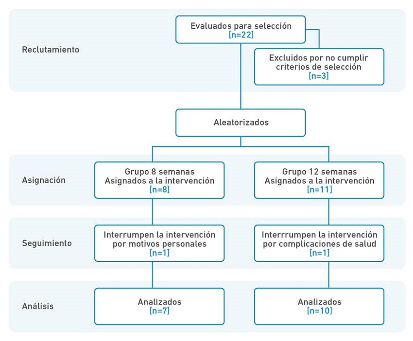 La recolección de la muestra fue realizada entre febrero de 2019 y marzo de 2020. Durante este período fueron remitidos 22 participantes para evaluar su elegibilidad, de los cuales fueron excluidos 3 sujetos tras no cumplir los criterios de selección y se aleatorizaron 19 personas a los grupos de estudio: 8 en el grupo de 8 semanas y 11 en el grupo de 12 semanas. Una vez iniciada la intervención hubo dos abandonos, por lo cual se realizó el análisis final con 17 participantes (ver Figura 1). Durante la recolección de la muestra no se presentaron eventos adversos y no fue posible completar el tamaño muestral por causa del confinamiento obligatorio decretado por la pandemia.