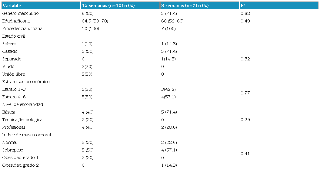 La muestra final estuvo conformada por 13 hombres y 4 mujeres, con un promedio de edad de 63.1±6.9 años. No se encontraron diferencias estadísticamente significativas entre los grupos de intervención en cuanto a las variables sociodemográficas, antropométricas y clínicas (p>0,05) (ver Tabla 1).
