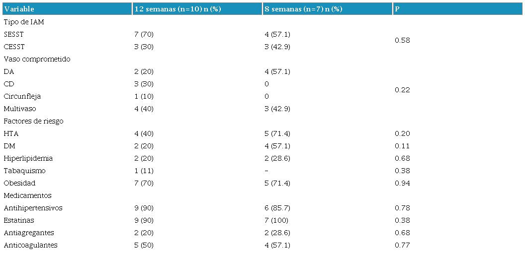 Teniendo en cuenta las variables clínicas, el tipo de infarto más común fue sin elevación del segmento ST, el vaso más afectado fue la descendente anterior, los factores de riesgo cardiovascular más prevalentes fueron la obesidad, seguido por la hipertensión, y los medicamentos de mayor consumo fueron los antihipertensivos y las estatinas (ver Tabla 2).