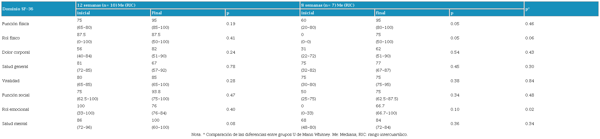 Al comparar los resultados de la escala SF-36, en la línea de base y postintervención en cada uno de los grupos de estudio, se evidencia que hubo mejoría en la función física y rol físico del grupo de tratamiento de 8 semanas. Al realizar la comparación entre grupos, se evidencian diferencias estadísticamente significativas en el rol emocional (p=0,02), siendo mayor el delta del cambio en el grupo de 8 semanas (ver Tabla 3).
