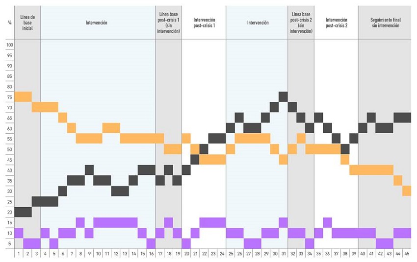 En el puntaje de aciertos de las pruebas de medición CAB-AT [19] (línea negra de la Figura 2) se calcula un porcentaje de datos no solapados (PND) de 91%, indicando que 41/45 datos superan los datos de la línea de base y llama la atención que se mantiene elevado en momentos sin intervención. El porcentaje de aciertos conserva una línea predominantemente ascendente con algunos descensos en los periodos posthospitalización sin alcanzar puntajes encontrados en línea de base.