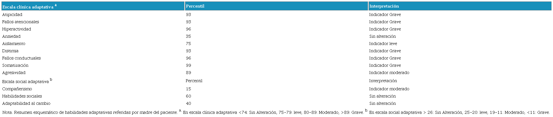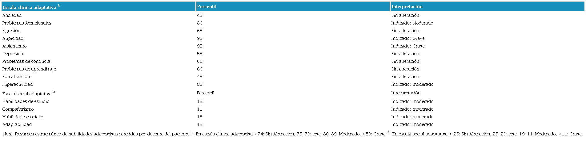 Las escalas de habilidades adaptativas BASC [16], tanto en el componente reportado por la madre del paciente como por la docente, confirman los hallazgos referidos previamente en la anamnesis, expresando indicadores moderados y graves, principalmente en atipicidad del comportamiento, hiperactividad, fallos atencionales y conductuales.